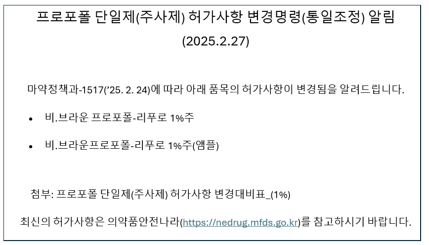 의약품 허가 변경에 관한 공지 - 프로포폴 단일제(주사제) 허가사항 변경명령