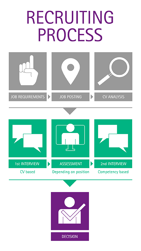 이 그래픽은 채용 프로세스의 기본 흐름을 보여줍니다. 물론 이는 국가마다 다를 수 있습니다. 적합한 직무를 선택하면 현지 인사팀 당당자가 해당 절차를 자세히 안내해 드릴 것입니다.